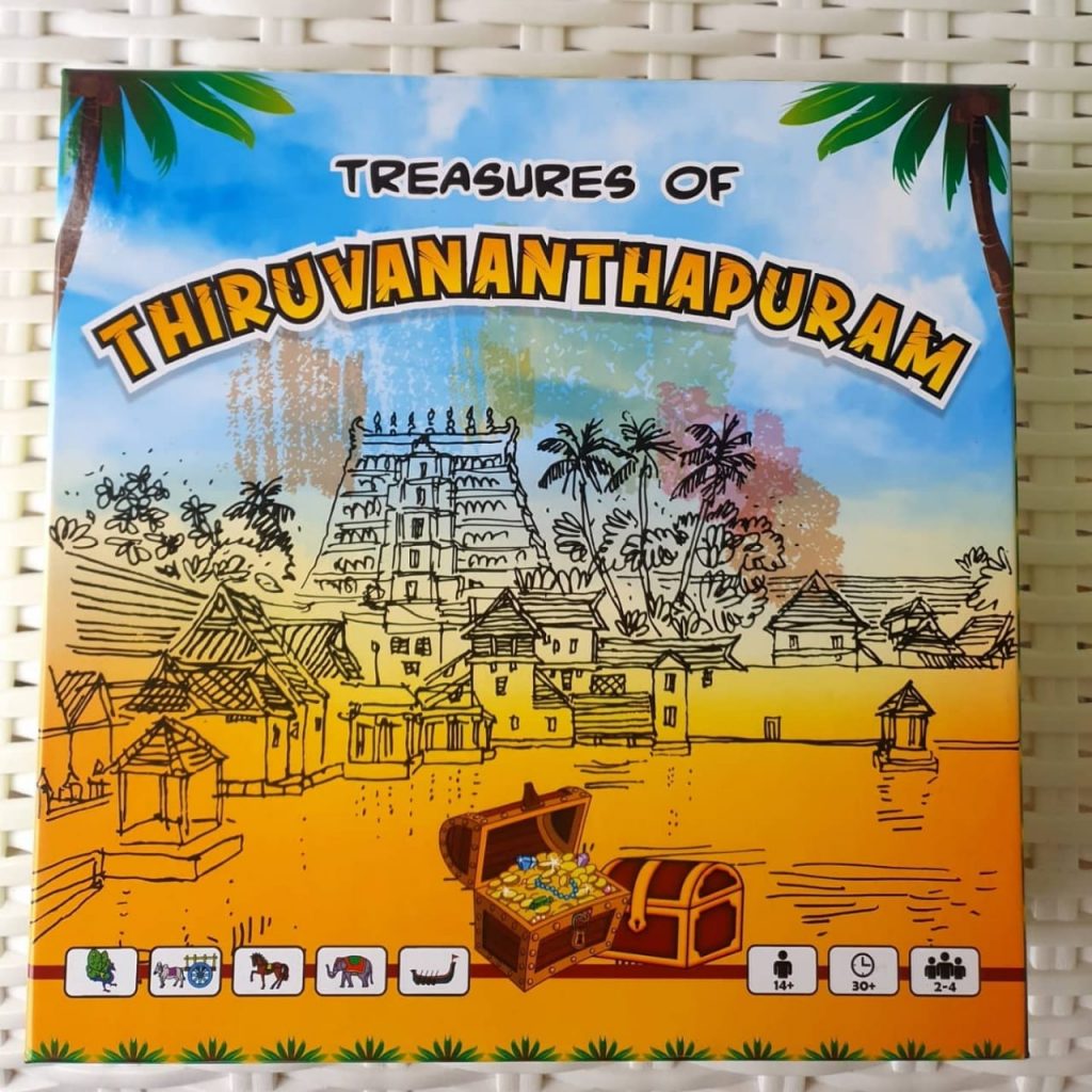 Treasures of Thiruvananthapuram is a family treasure hunt board game which challenges skill, luck and decision making ability in you. It has treasure cards, custom made wooden dice from Ludhiana, handcrafted wooden pawns from Channapatna and cloth bags all made from eco-friendly products. The game is set in the backdrop of Kerala and can be played by four players at a time. The game play has two phases. Phase one involves a player traversing on the board using different modes of transport and finally reaching the temple in Kerala. And the second phase involves code cracking the treasure vaults and winning the treasure cards while trying to reach the destination. The player who has the maximum value of treasure in the end wins the game.