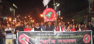 Guwahati : 30 indigenous organisations led by All Assam Students Union (AASU) took out torchlight processions across the State in protest against the Citizenship (Amendment) Bill on Thursday evening. The participation in the rally was spontaneous with people from all walks of life joined the march. Members of AASU sharply opposed CAB and shouted various slogans against the Prime Minister Narendra Modi, CM Sarbananda Sonowal and BJP government.“If the bill is passed in Rajya Sabha, it will render the Assam Accord null and void and will also make the NRC process meaningless,” said Samujjal Kumar Bhattacharya, AASU Chief advisor, while taking part in Guwahati procession. Similarly in Jorhat, the protesters demanded Chief Minister Sonowal to stand with the people of Assam and to take action against the bill.
