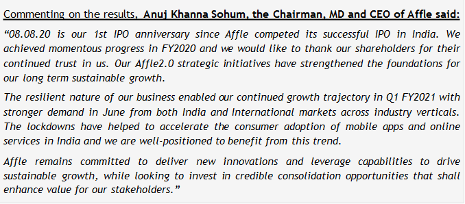 Affle reported a strong performance for Q1 FY2021 with a consolidated revenue from operations of Rs. 89.8 crores, an increase in revenue by 20.4% y-o-y. EBITDA was at Rs. 22.5 crores, an increase of 20.3% y-o-y. PAT increased by 42.3% y-o-y to Rs. 18.8 crores, and PAT margin stood at 20.4% for the quarter, an expansion of 2.7% from Q1 last year. This growth has been broad-based coming from both CPCU business and Non-CPCU business. The CPCU business continued its positive momentum delivering a total of 1.7 crore of converted users in Q1 FY2021.