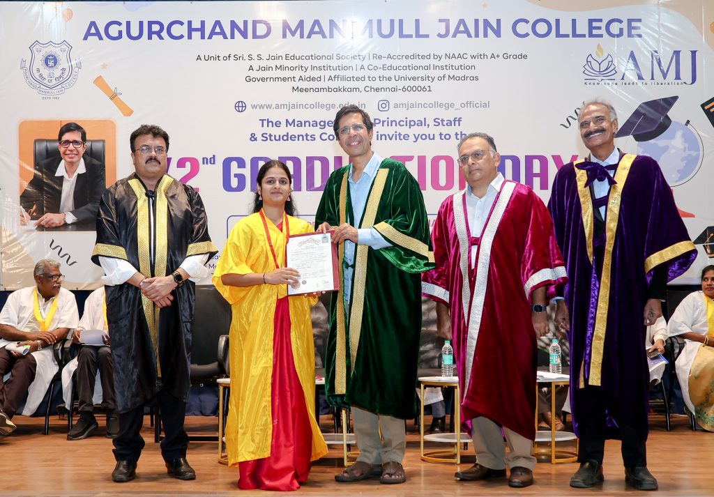 Chennai : Agurchand Manmull Jain (A.M. Jain) College, an NAAC A+ accredited institution, celebrated a significant milestone in its long-standing tradition of academic excellence with its 72nd Graduation Day Ceremony for the aided stream, honouring the achievements of 537 students from the 2023-24 batch across diverse undergraduate and postgraduate programmes.