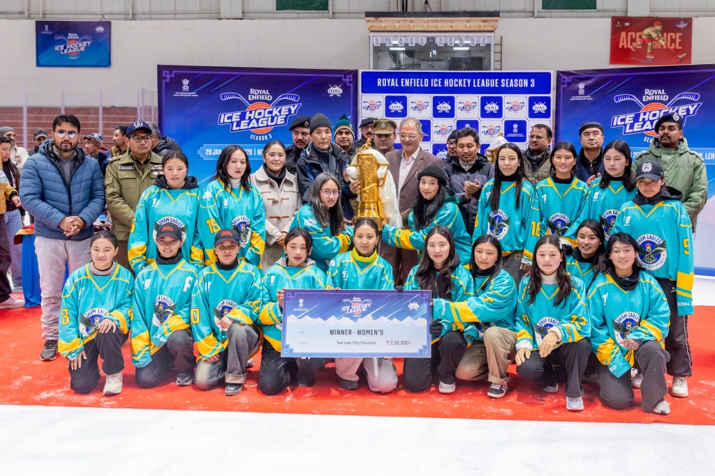 : Mohd Issa, Ghulam Nabi Tak and Waseem Bilal struck in the final period as Humas Warriors were crowned men’s champions of the Royal Enfield Ice Hockey League Season 3, defeating Purig Warriors 3–1 at the Nawang Dorjay Stobdan (NDS) Stadium. Organised in partnership with the UT Administration of Ladakh and the Ice Hockey Association of Ladakh, the final remained finely poised for two periods before Humas delivered a decisive late surge to lift the trophy.
