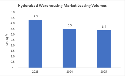Hyderabad : Knight Frank India, a leading international property consultancy, in its latest report- India Warehousing Market 2025, cited that Hyderabad’s warehousing market recorded transactions of 3.4 mn sq ft in 2025, which in 2024 was 3.5mn sq ft, reflecting a dip of 5% year-on-year (YoY). While transaction volumes softened slightly compared to the previous year, the market continues to demonstrate stability, supported by strong occupier interest, sustained infrastructure development, and a steady pipeline of active RFPs across key sectors.