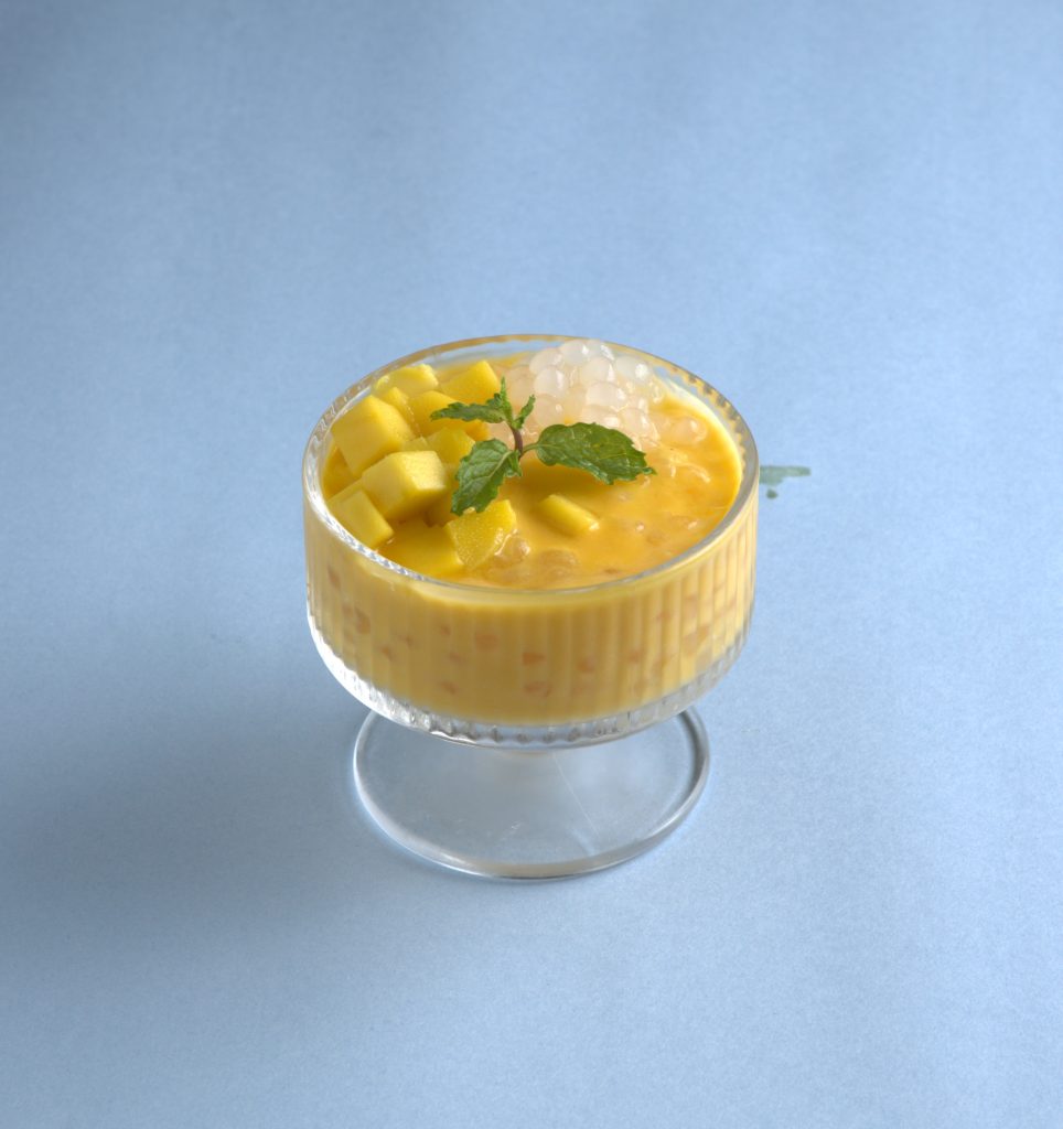 The meal concludes on a sweet note with desserts such as Mango Sago, a smooth mango coconut cream with soft sago pearls, and Golden Sesame Balls, featuring a crispy exterior with a delicate sweet filling.