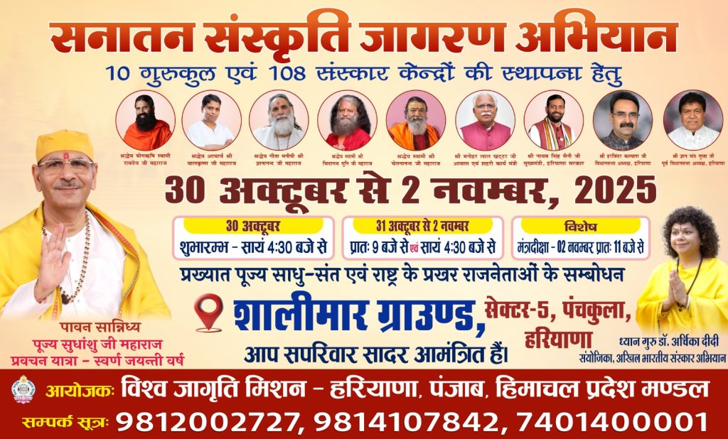 Panchkula, Haryana: Continuing its nationwide movement to revive India’s timeless spiritual and cultural values, the Vishwa Jagriti Mission is set to host the Sanatan Sanskriti Jagaran Abhiyan from 30 October to 2 November 2025 at Panchkula, Haryana. This grand four-day event will be held under the guidance of Sudhanshu Ji Maharaj and Dr. Archika Didi, who will address thousands of devotees and dignitaries gathered from across the country to celebrate the ideals of India’s eternal culture.