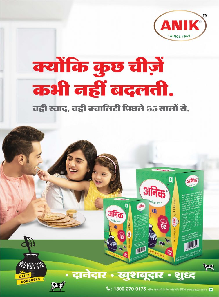 “Ghee category has a peak seasonality during the Indian festive season starting from Navratri till Diwali”, said, Mr.Srinivas Raju, CEO, Anik Milk Products Pvt. Ltd.,“Consumer’s health is of utmost importance to us. High standards of quality control while procurement of milk and butter during production helps us in maintaining superior quality of the ghee. Zero compromise on quality makes Anik Ghee a healthier choice for customers.We work with more than 700 distributors across India and have plans of expansion in Delhi NCR, Punjab, Himachal Pradesh as well asJammu &Kashmir. We have also introduced a 30 ml ghee sachet at just Rs 20, with this and our expansion plans; we aim to reach every Indian household this festive season.”