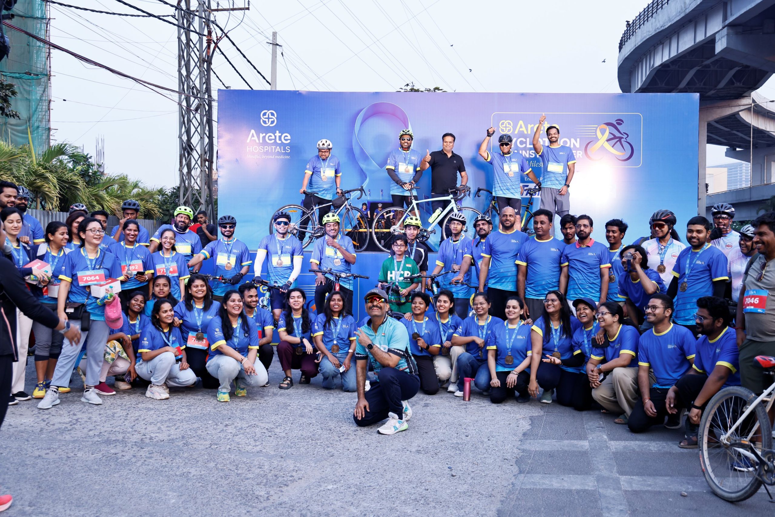 The cyclothon flagged off at 5:30 AM from Arete Hospitals and concluded at the same venue by 8:30 AM. Corporates and families took part in the 7.5 km and 22.5 km ride categories as part of the cancer awareness initiative.