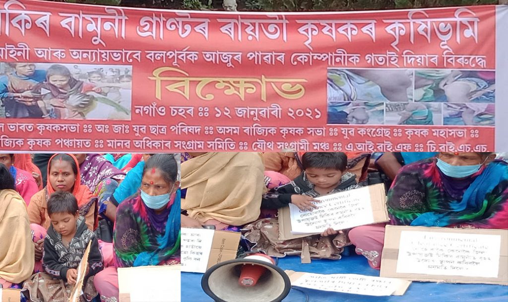 Hundreds of farmers and their families including women and children from the Bamuni Mikir Grant area participated in the stir and demanded an enquiry against the recent police atrocity on the farmers and women during a democratic protest against government’s decision at Bamuni Mikir Grant. During the agitation, the protesters shouted various slogans against the cruel and inhumane assault on indigenous farmers and women by Nagaon police and also sought justice to them. Criticizing the stand of the government towards the indigenous farmers, several leaders of those farmers organizations said that the BJP led state government promised to protect the ‘Jati – Mati – Bheti’ of the indigenous peoples of the state and now pulling the reigns of the state’s power, the same BJP took a ‘U’ turn. Besides, the government moved against the indigenous communities, they alleged. They however claimed that the entire area of Bamuni Mikir Grant is an elephant corridor and how the district forest department provided the clean sheet to the government is a big question to all.