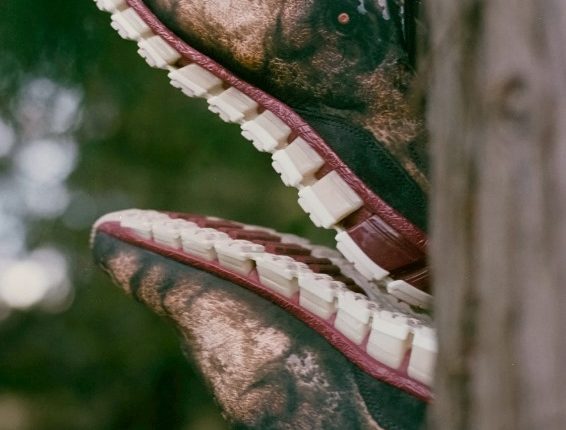 The sole feature is a color scheme inspired by the image of a dinosaur’s teeth and gums. When the heels of both shoes are placed together, and the toes are moved, it appears as if a dinosaur is chomping its jaws open and shut.