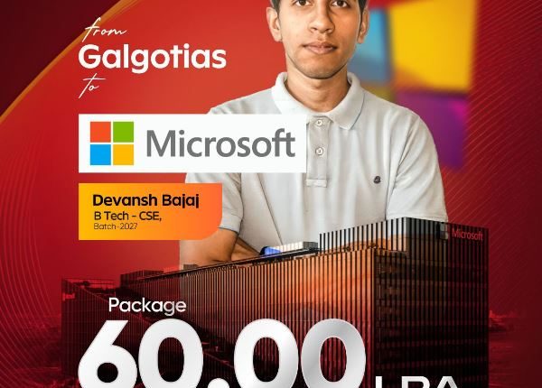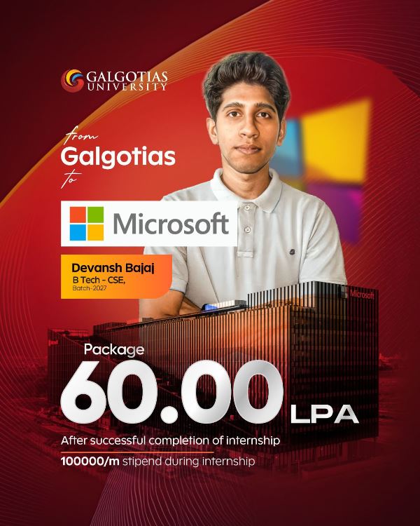 Greater Noida: For Devansh Bajaj, a B.Tech Computer Science and Engineering (Batch of 2027) student at Galgotias University, achieving a ₹60 LPA total package at Microsoft is not just a personal milestone, it’s a reflection of how curiosity, persistence, and structured mentorship can shape exceptional outcomes. His journey from a passionate learner to securing a role with one of the world’s most innovative tech companies illustrates the power of industry-focused education that blends academic rigor with hands-on learning.
