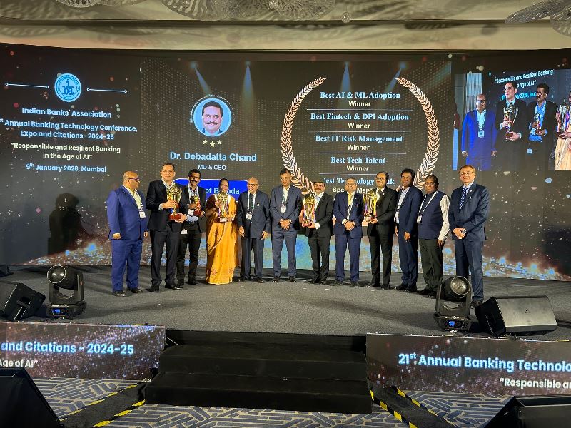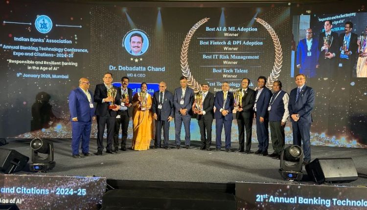 Bank of Baroda, one of India’s leading public sector banks, has been recognised for its leadership in technology and innovation at the prestigious Indian Banks’ Association’s (IBA) 21st Annual Banking Technology Awards 2024-25, winning honours across five award categories among Large Banks, including four wins and one Special Mention. Bank of Baroda was adjudged the Winner in four categories – Best AI & ML Adoption, Best Fintech & DPI Adoption, Best IT Risk Management and Best Tech Talent. In addition, the Bank received a Special Mention in the Best Technology Bank category.