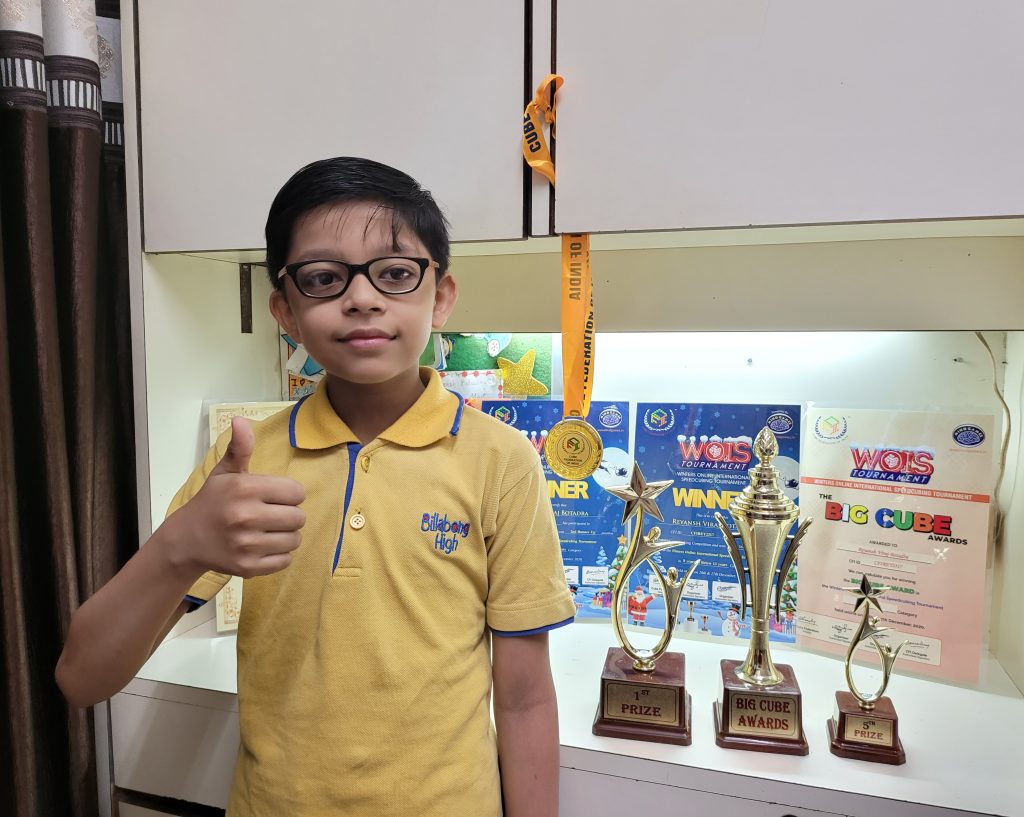 11-Year-old Grade 6 student Vivaan who participated in Cube Pluss Winter Open in one category of WIOS tournaments won the Gold medal in a 3×3 level of speedcubing. He also emerged as the 2nd runner up in solving Pyraminx puzzle and secured 1st position in solving 4×4 & 5×5 High IQ Megaminx cube in a given time. Vivaan’s junior, 7-Year-old grade 3 student Reyansh Botadra bagged 3 trophies and Gold awards in Online Rubik’s Competition of the same tournament. He achieved 1st position in solving Pyraminx Cube and emerged as the 2nd runner up in solving Skewb cube.