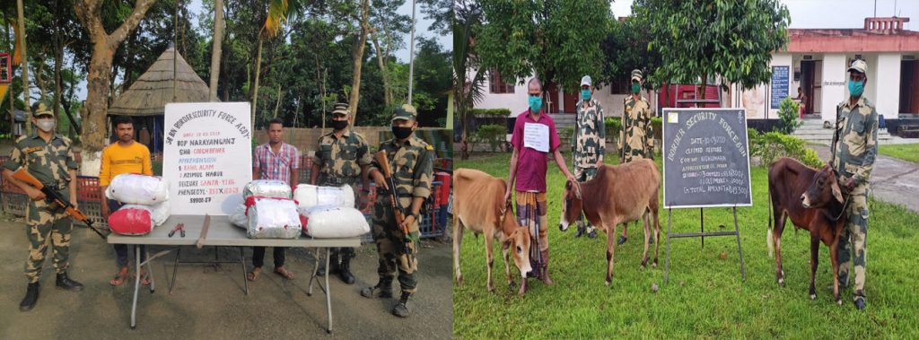 BSF troops are always alert towards the issues of trans-border crimes and illegal infiltration and are making all endeavours to contain such trans-border crimes.In different operations, troops of Border Security Force under Guwahati Frontier apprehended two Indian smugglers and rescued 229 cattle heads from the bordering areas of District Coochbehar (West Bengal), Dhubri & South Salamat (Assam) On intervening night of 09/10 Sept’ 2020. Acting on tip off, on intervening night of 09/10 Sept’ 2020, troops of BSF BOP Boreralga of 06 Bn BSF under Guwahati Frontier carried out a special operation in general area of village Kaliralga, PS- Kharwabandha, Distt- South Salamara (Assam) and apprehended an Indian cattle smuggler along with two cattle heads, while these were being smuggled from India to Bangladesh.