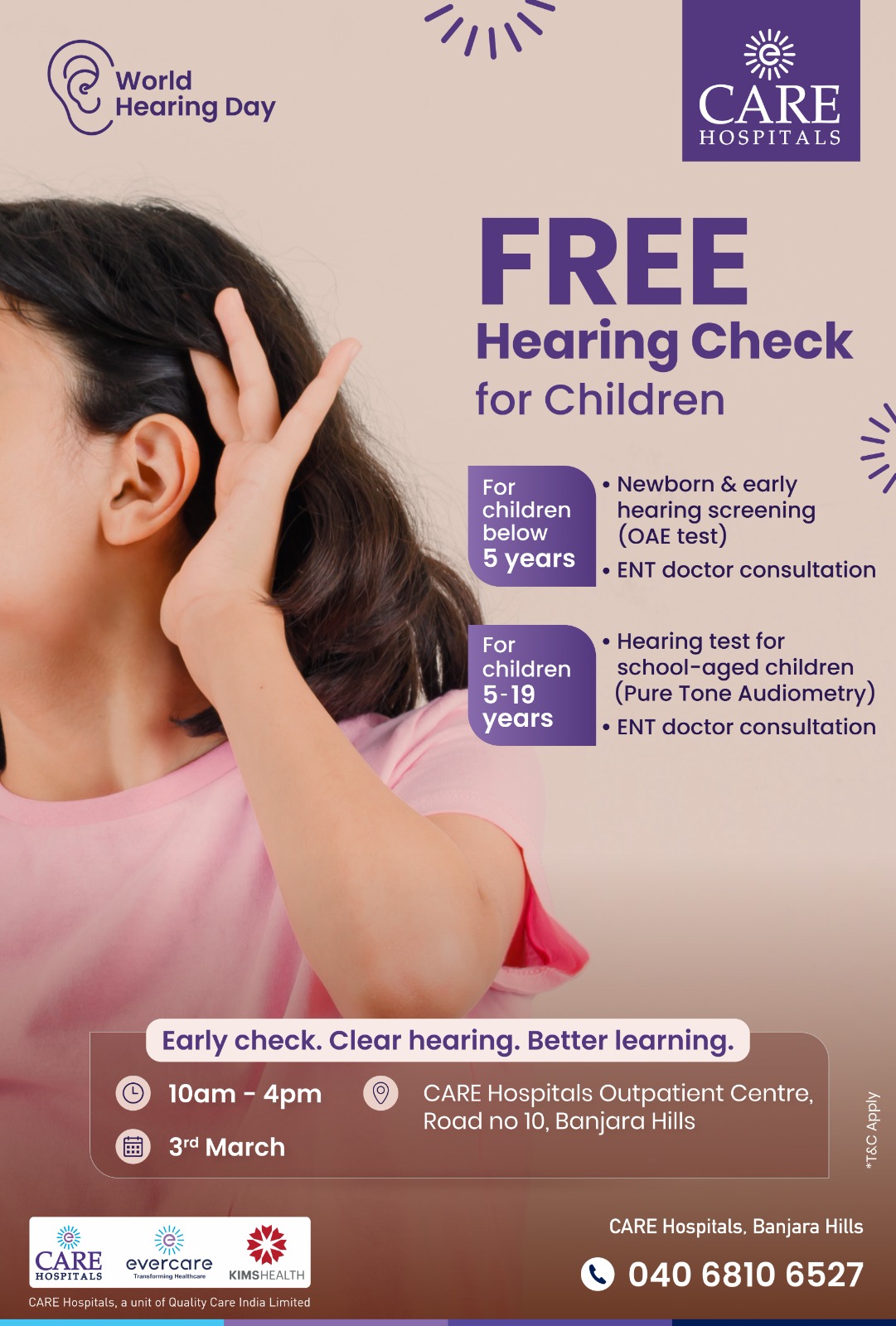 The free camp will be conducted on 3rd March 2026 from 10 a.m. to 4 p.m. at the ENT & Audiology Department, CARE Outpatient Centre, Banjara Hills. This initiative reflects the hospital’s continued commitment to preventive healthcare and child wellness.