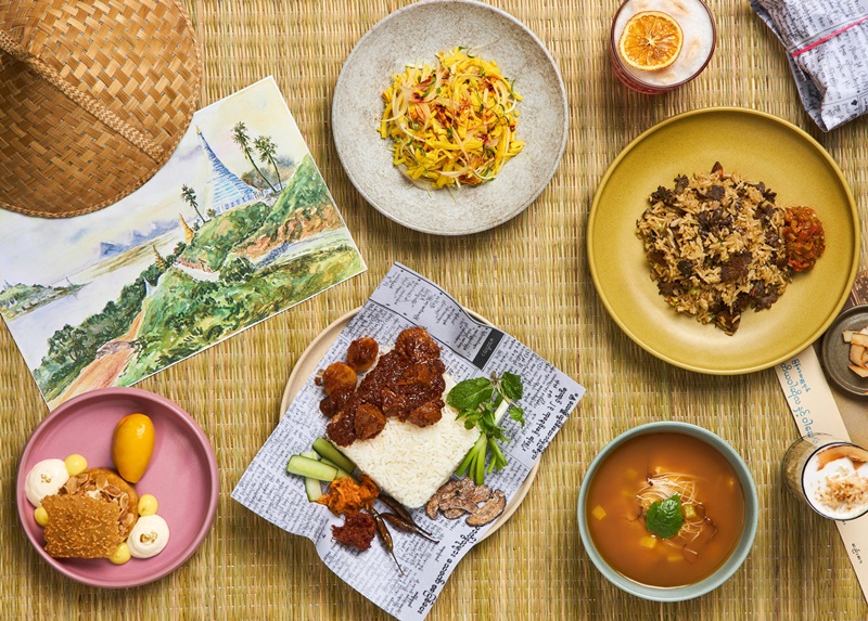 The menu also features Siman Thoke- a refreshing salad of chickpea tofu and raw papaya with a sour and spicy dressing from Shan, and the Steamed Rice Tofu Salad, a cold rice salad with coriander, shallot oil, crispy garlic, and chilli from Kokang. Moreover, the Highway Meal Parcel which is a popular food with commuters to Yangon with steamed rice, mock meat and potato curry, radish pickle, cucumber, mushroom chips, and mint and shallot salad is truly a favourite. Inspired by the sustainable practices from the monasteries of Bago, Monk’s Meal or Kho Poong with Pebok Chet featuring bamboo shoot and roselle curry with a spicy fermented soybean relish and rice, are local delicacies that find their place on this celebratory menu. And finally, try the Split Gill Mushroom Rice from Kachin that includes foraged split gill mushrooms with rice, flavoured with roasted mushroom extract, garlic, and soy topped with Burmese pounded tomato is also a must-have.