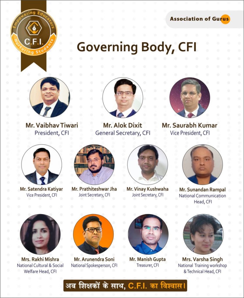 CFI comprises of members from the leading coaching institutions across the country like Bansal Classes, ALLEN, Vidyamandir Classes, etc. who have joined hands to represent this supportive industry critical for the success of a student. Key personnel involved are – Mr. Prathiteshwar Jha, Joint Secretary, CFI, Mr. Vinay Kushwaha, Joint Secretary CFI, Mr. Sunandan Rampal, National Communication Head, CFI, Mrs. Rakhi Mishra, National Cultural and Social Welfare Head, CFI, Mr. Arunendra Soni, National Spokesperson, CFI, Mr. Manish Gupta, Treasurer, CFI and Mrs. Varsha Singh, National Training workshop and Technical Head, CFI.