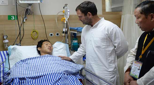 Guwahati : Congress president Rahul Gandhi on Tuesday visited Apollo Hospital in Guwahati to meet two patients, who sustained injuries during Arunachal Pradesh violence. After landing at Lokpriya Gopinath Bordoloi International Airport in Borjhar he left for Apollo Hospital to meet the patients. During his visit to the hospital Rahul wished the patients “a speedy recovery”.He also met the family members of the patients and took stock of the situation in Arunachal Pradesh. Congress leaders like Harish Rawat and Rockybul Hussain also accompanied him to the hospital. Congress president Rahul Gandhi is visiting Guwahati to kick-start his campaign in the State.