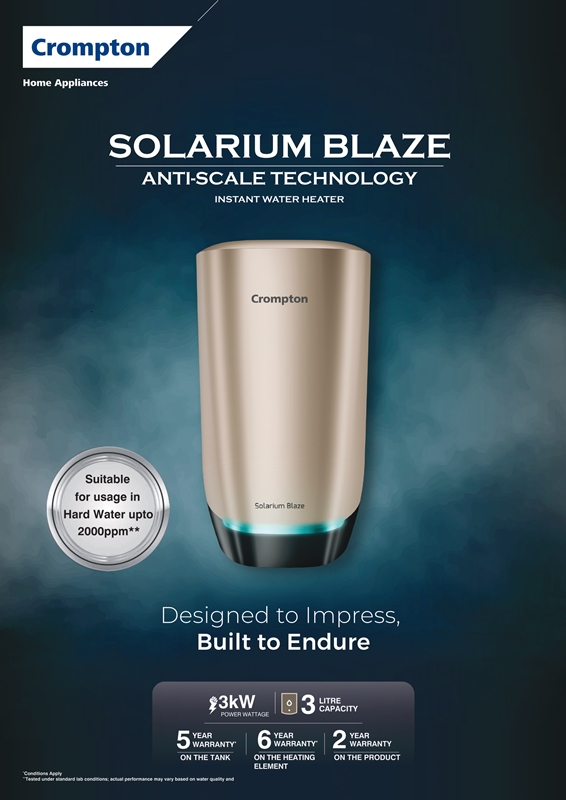 Speaking about the new launch Malhar Vadke, Vice President – Large Domestic Appliances, Crompton Greaves Consumer Electricals Ltd said, “Today’s homes need appliances that can perform reliably in demanding conditions while also complementing modern lifestyles. With Solarium Blaze, we have brought together design expertise and robust Anti-Scale Technology to tackle the growing issue of hard water – a concern especially heightened during the monsoons. Built to deliver efficient heating and long-term durability, it also brings a premium aesthetic that fits seamlessly into contemporary spaces. This launch is a testament to Crompton’s focus on meaningful innovation that solves everyday problems and enhances the overall user experience.”