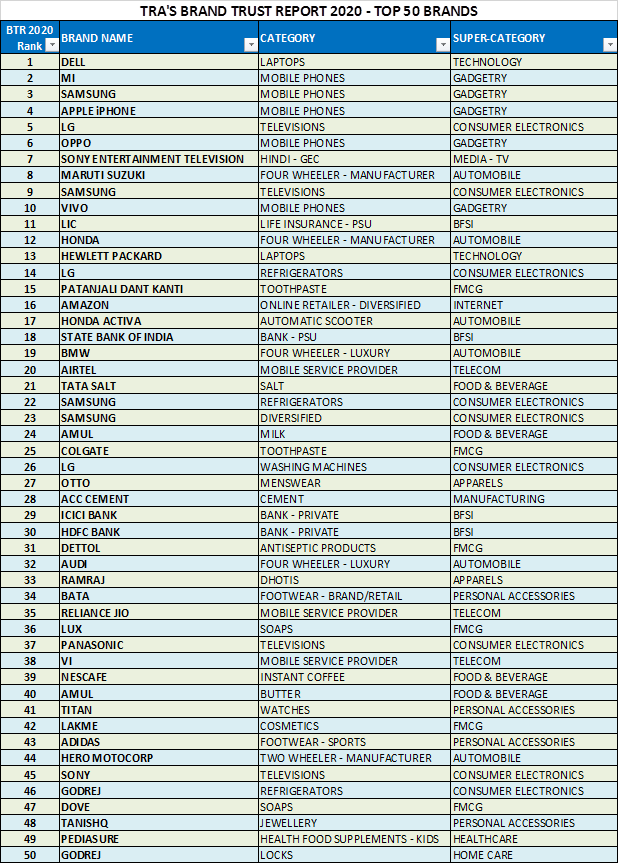 Mumbai: Dell has achieved top slot as India’s Most Trusted Brand second year in a row in TRA’s Brand Trust Report (BTR) 2020, the tenth edition in its series. It is followed in second place by Mi Mobiles, which also leads the Mobile Phone Category for the first time this year. Samsung Mobiles secures the 3rd place, followed by Apple iPhone and LG Televisions taking 4th and 5th ranks, respectively.