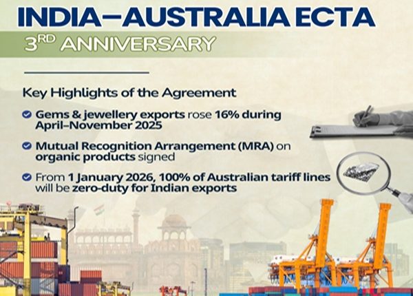 New Delhi: All Indian exports will receive duty-free access in the Australian market from today under the India-Australia Economic Cooperation and Trade Agreement (ECTA). Under the agreement, 100 percent of Indian tariff lines will get duty-free access to the Australian market, benefiting key sectors such as gems and jewellery, textiles, leather, footwear, furniture, food products, engineering goods, medical devices and automobiles. India, in turn, will offer preferential access on over 70 percent of tariff lines to Australia, mainly covering raw materials and intermediates like coal, mineral ores and wine. Union Commerce and Industry Minister Piyush Goyal had announced this on the third anniversary of the ECTA on December 29 last year. The move is expected to further boost India’s exports, strengthen bilateral trade, and deepen economic ties between the two countries.