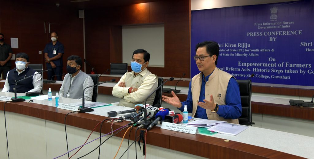 GUWAHATI :Farmers of North East will be the biggest beneficiaries of this new agricultural reforms by the Union Government”, Union Minister of State(I/C) for Youth Affairsand Minister of State for Minority Affairs KirenRijiju said during a press conference today in Guwahati.ShriRijiju along with Chief Minister SarbanandaSonowal, Union Minister of State for Food Processing RameswarTeli and Agriculture Minister of Assam Shri Atul Bora held the press conference on “Agricultural Reforms Acts-Historic steps taken by Government of India”.