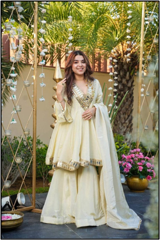 The Ivory Mirror Work Anarkali Sharara Set with Dupatta from Vastrakaala brings that essence to life with its soft, sophisticated palette and intricate mirror detailing. The flowy Anarkali silhouette paired with a sharara adds movement and elegance, while the delicate embellishments lend a subtle festive shimmer.