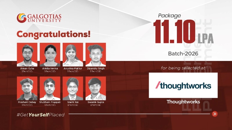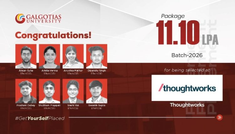 Greater Noida: Galgotias University continues to raise the bar in campus placements as its talented B.Tech (CSE) students from the Batch of 2026 secure roles at Thoughtworks with a package of 11.10 LPA. The milestone underscores the University’s robust academic environment, hands-on training modules, and strong industry engagement.