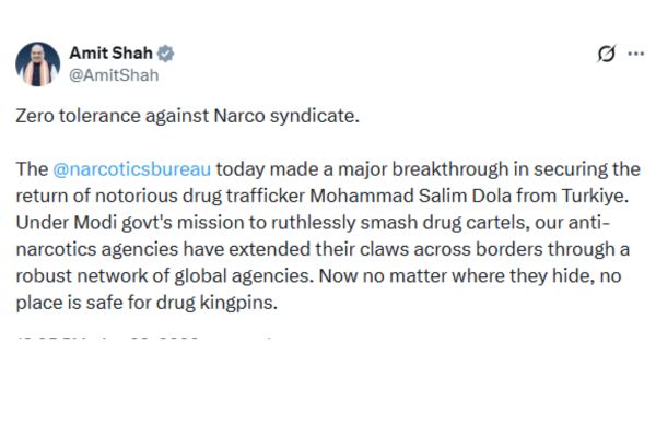 Union Home Minister Amit Shah said that Narcotics Control Bureau has made a breakthrough in securing the return of Salim Dola from Türkiye. He said, the arrest of Salim Dola reflects the Narendra Modi government’s firm resolve to bring all narcotics fugitives and members of organised crime syndicates to justice.