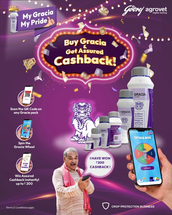 Commenting on the initiative, Mr. Rajavelu N.K, CEO – Crop Protection Business, Godrej Agrovet said, “Gracia is an economical and effective solution available in the market including the conventional ones. Its quicker control against chewing pests and thrips, compared to peers, provides farmers with one of the lowest costs per day treatment. We encourage farmers to scan the QR code on the Gracia pack to verify the product authenticity and also stand a chance to win a cashback.”
