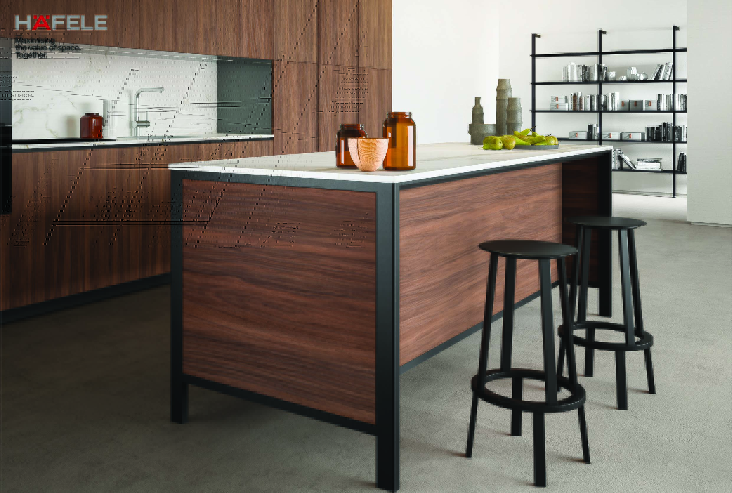 A key highlight of the Häfele Islene system is its enhanced aesthetics, achieved through premium black finish profiles that complement a wide range of surface materials, including stone, glass, and wood. This refined finish allows the system to blend effortlessly with premium interiors while creating a visually striking island structure. The clean profile design supports clutter-free layouts and aligns perfectly with minimalist and modern kitchen styles, ensuring that the island becomes a focal point that enhances the overall look and feel of the space.