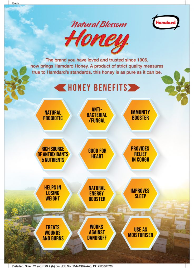 Hamdard’s Natural Blossom Honey is available in 3 different sizes – 50gms, 250gms and 500gms PET Bottles at economical prices of Rs.35, Rs.110 and Rs.199 respectively. The market will soon see various promotions across these SKUs.The product is now present across all major markets in the country.