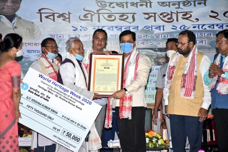 Guwahathi: The Assam Chief Minister Sarbananda Sonowal said that historical monuments and antiquities are the symbols of the art, culture and people of a state. Left by the ancestors, all have a duty towards protection and preservation of the historical monuments. Assam government has taken sequel of steps for the preservation of its historical monuments of the state for projecting Assam as one of the leading states in the world in the field of historical monuments. Inaugurating the World Heritage Week 2020 at Sivasagar today, Chief Minister Sonowal said that the Central government led by Prime Minister Narednra Modi earmarked Sivasagar as one of the five iconic sites in the country and therefore, taken several steps for the protection, preservation and beautification of the historical monuments of the district. He at the same time said, “Built by our forefathers, State government is committed to promote the state and the rare monuments”. He, therefore, called upon everybody to share collective responsibility to project the monuments and antiquities of the state before the world community. Chief Minister Sonowal also said that the Directorate of Archaeology has taken positive steps to preserve the lineage of the 42 Ahom Kings as well as other monuments scattered in several areas of the state. Sonowal also laid emphasis on generating awareness among the young generation about the rich cultural heritage of the state, as he asked the district administrations and public representatives to take steps in this regard. He said that the district administration and public representatives need to take proactive steps for acquainting the students with their rich cultural heritage in their respective districts. Synchronising with the occasion, Sonowal in acknowledging the role, conferred award christened ‘Aithijya Mitra’ on Krishna Kumar Sinha of Hojai, Nabin Buragohain of Sivasagar, Ghuguwa Preservation Committee of Dhemaji as the award consists of certificate, angabastra, approbation and Rs. 50 thousand to each of the awardees. Moreover, in recognition to their works related to preservation of historical monuments, Chief Minister Sonowal also felicitated Dilip Buragohian, Jiten Borpatrogohain, Dr. Atul Buragohian, Purna Gogoi and Tulsi Neog. Chief Minister synchronsing with the occasion also released books named Archaeological Heritage of South Asia, Handbook on Archaeology of Assam and Exploration Report of West Karbi Anglong district. Speaking on the occasion, Minister for Archaeological matter Keshab Mahanta said that in accordance with the declaration of Sivasagar as iconic sites along with other four sites, Centre has sanctioned Rs. 3500 crore for the preservation and beautification of the cultural heritage. He also said that a world class museum will be built in Sivasagar for the preservation and beautification of the archaeological sites of Sivasagar. Moreover, for the proposed inclusion of Charaideo’s Maidam into UNESCO’s world heritage site, State government took a project involving Rs. 25 crore for the preservation and beautification of the maidams. The programme where welcome address was given by Commissioner and Secretary Cultural Affairs Preetom Saikia, Chief Secretary Jishnu Baruah also spoke on the occasion. Minister of State for Revenue and Disaster Management Jogen Mohan, MP Rajya Sabha Kamakhya Prasad Tasa, MLAs Kushal Duori Nabanita Handique, Rituporna Baruah, CEM Sonowal Kachari Autonomous Council Dipu Ranjan Makrary, Chairman AHSEC Dayananda Buragohian Director Archaeology Department Deepirekha Kuli, DC Sivasagar Lakhinandan Gogoi and a host of other dignitaries were present on the occasion.