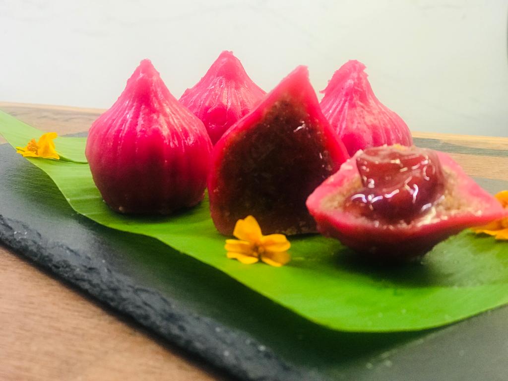 - Stuff the strawberry filling and the coconut filling and press in the modak mold.