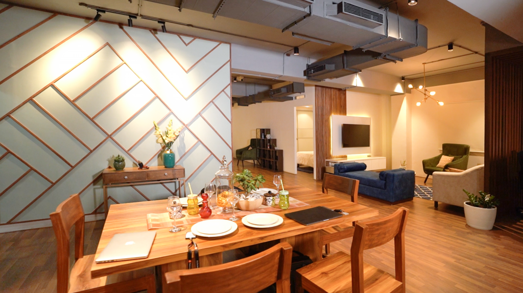 Housejoy’s Experience Centre is divided into 5 zones: reception, waiting area for customers, bedroom + library + kitchen (through a sample apartment that showcases the specs), discussion rooms, and an experience zone that gives ideas on plot, footing, plinth, slabs, formwork, brickwall + specifications. Each zone has been planned strategically to give customers real-time insights into processes and allow them to discuss and plan comfortably.