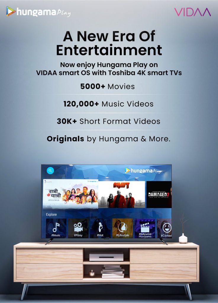 Speaking about the cooperation, Siddhartha Roy, COO, Hungama Digital Media said, “Adopting connected smart TVs in India is increasing at a rapid pace of 2 to 2.5x per year. On Hungama Play too, we have seen a 2.8x increase in consumption on smart TVs since 2019 and expect this number to double in the next three years. We are glad to partner with Toshibafor VIDAA and offer their users access to a vast multilingual and multi-genre content library. We are certain that users will find the experience of watching our premium content on Toshiba’s 4K smart TVs highly enriching.”