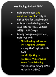 The report highlighted that among Non-gaming apps across all regions, the Finance and Travel verticals suffer from the highest fraud rates. APAC markets are responsible for the highest fraud rates in the Finance and Travel verticals due to high cost per install rates and large marketing budgets. Fraudsters are attracted by scale and high payouts, both of which characterize these verticals. Work from home and monitoring finances online, mainly via banking apps, marked as the key reason for rise in online frauds in Finance vertical.