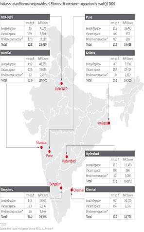 “India has more than 600 mn sq. ft. of Grade-A office space across its top seven cities in Q1 2020, and saw record absorption, steady rentals and low vacancy levels till this period. While we’re observing a temporary pause due to the global pandemic, this space is expected to bounce back. We’re expecting to see attractive investment opportunities in the strata office space, which is estimated to be ~180 mn sq. ft. valued at ~INR 2.26 lakh crore (USD 30 bn).” said Vishal Ahuja, Head, Private Wealth Group, JLL India.