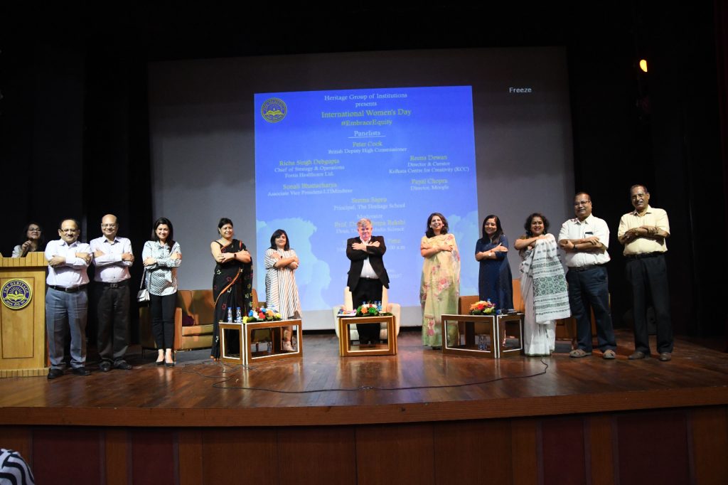 Kolkata: Heritage Group of Institutions, Kolkata, celebrated International Women’s Day by organizing a panel discussion on the theme ‘Embrace Equity’. The panelists were Mr. Peter Cook, British Deputy High Commissioner, Ms. Reena Dewan, Director & Curator, Kolkata Centre for Creativity (KCC), Ms. Sonali Bhattacharya, Associate Vice President, LT MindTree, Ms. Richa Singh Debgupta, Chief of Strategy & Operations, Fortis Healthcare Ltd. and Ms. Payal Chopra, Director, Moople. The panel discussion was moderated by Dr. Madhupa Bakshi, Dean, Department of Media Science, The Heritage Academy, Kolkata which is a part of Heritage Group of Institutions offering Bachelor of Science and Master of Science programmes in Media Science.