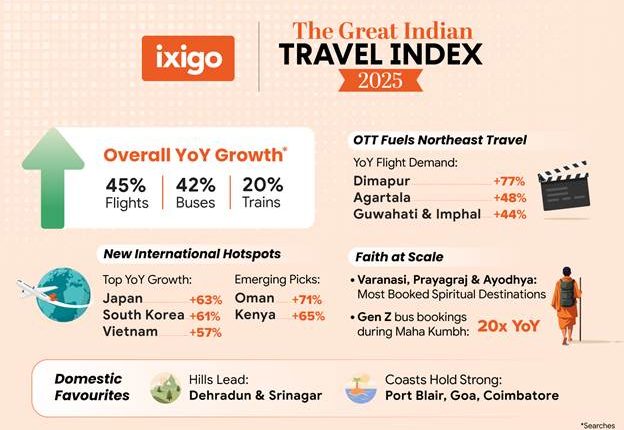 Bengaluru: 2025 was a standout year for travel in India, shaped by a packed calendar of cultural events, concerts, and large-scale religious gatherings, along with easier visa norms that sustained travel intent through the year. ixigo, India’s leading AI-based travel platform, revealed its “The Great Indian Travel Index 2025”, capturing how India travelled across flights, trains, and buses. The data reveals strong YoY momentum in 2025, with overall searches for flight up by 45%, train growing by 20%, and bus rising by 42% as compared to 2024.