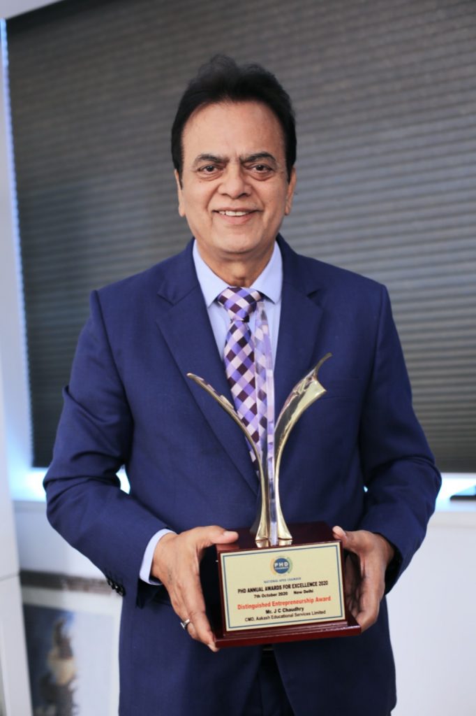 Mr J. C. Chaudhry, Chairman and Managing Director, Aakash Educational Services Limited (AESL), the national leader in test preparatory services, has been conferred with the prestigious and most sought after “Distinguished Entrepreneurship Award 2020” by apex industry body, PHD Chamber of Commerce (PHDCCI) for his outstanding contribution in the field of Education.
