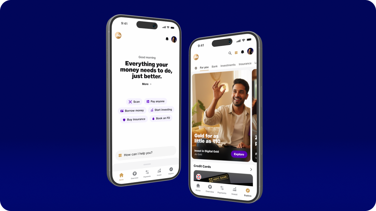 Marketplace for Intelligent Finance: An expansive digital storefront offering a diversified range of products from JFSL group companies and other trusted finance brands, including home loans, loans against securities, personal loans, credit cards, insurance, UPI, life and general insurance, JioBlackRock mutual funds and investment advisory, fixed deposits, digital gold, tax filing and planning, and an innovative savings account with automated liquidity management for higher returns.