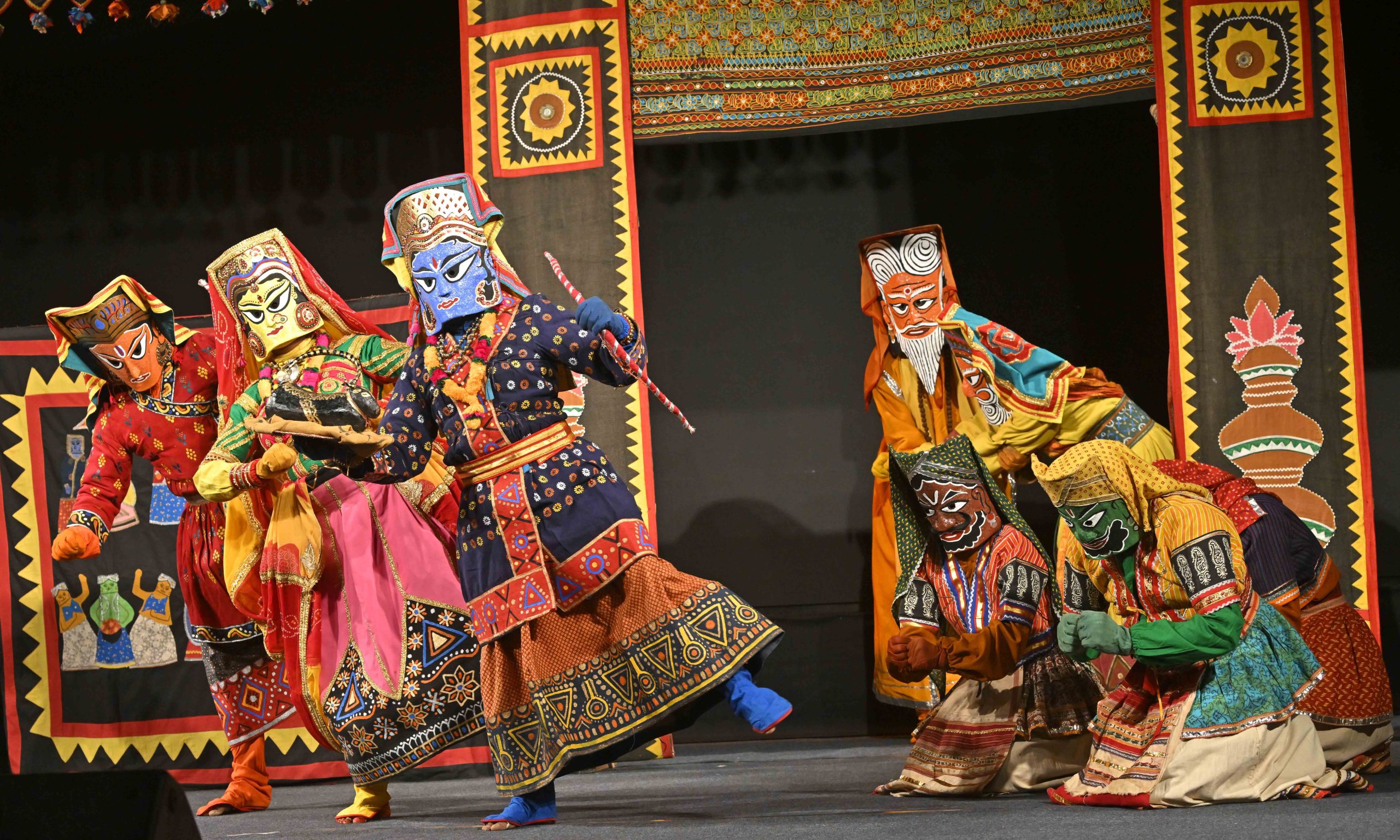 The evening opened with a rare puppet-style dance drama, The Ramayana, by the Rangasri Little Ballet Theatre, Bhopal. Originally premiered in 1953, this folkloristic production combined ballet and Rajasthani puppet traditions, featuring stylised movements, square masks, and vivid visual design. This production was described as “a stroke of genius” for its illusion of animated wooden puppets.