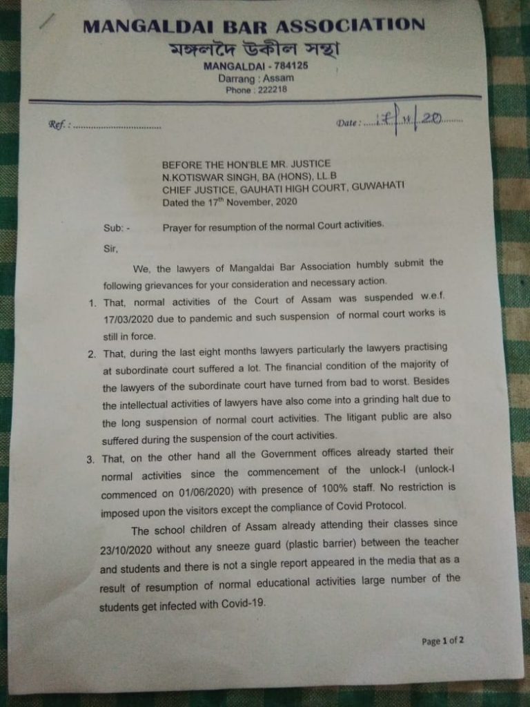 Mangaldai: The Mangaldai Bar Association has expressed strong grievance over non functioning of the Darrang district judicial courts in a normal manner since March 17 last . The lawyers body on Tuesday while approaching the Chief Justice of Gauhati High Court submitted a petition and expressed their grievance. In the petition they made an appeal before the Chief Justice to take necessary step for normal functioning of the lower courts and prosecutors on at the earliest. In the petition it pointed out that the normal activities of the court has remained suspended while other government institutions is running smoothly with hundred percent attendance since the month of June. Further schools and colleges are also got engaged in their normal routine without any sneeze guard . While making appeal for normal practice of the courts ,it is also brought to the notice of the Chief Justice, that pandemic situation in the state shows an remarkable improvement with 97.45 recovery rate and hardly 0.45mortality rate . The delegation of the Bar was led by Madhab Chandra Rajbongshi and Hemanta Kumar Sarma, President and Secretary of Mangaldai Bar Association respectively .