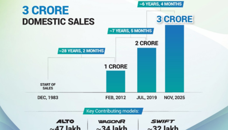 New Delhi: Maruti Suzuki India Limited (“Maruti Suzuki”), the country’s leading passenger vehicle manufacturer*, has set a new benchmark in the industry, by achieving cumulative sales of 3 crore units in the domestic market. This historic milestone has been attained within 42 years, reflecting the Company’s sustained leadership and deep customer trust.