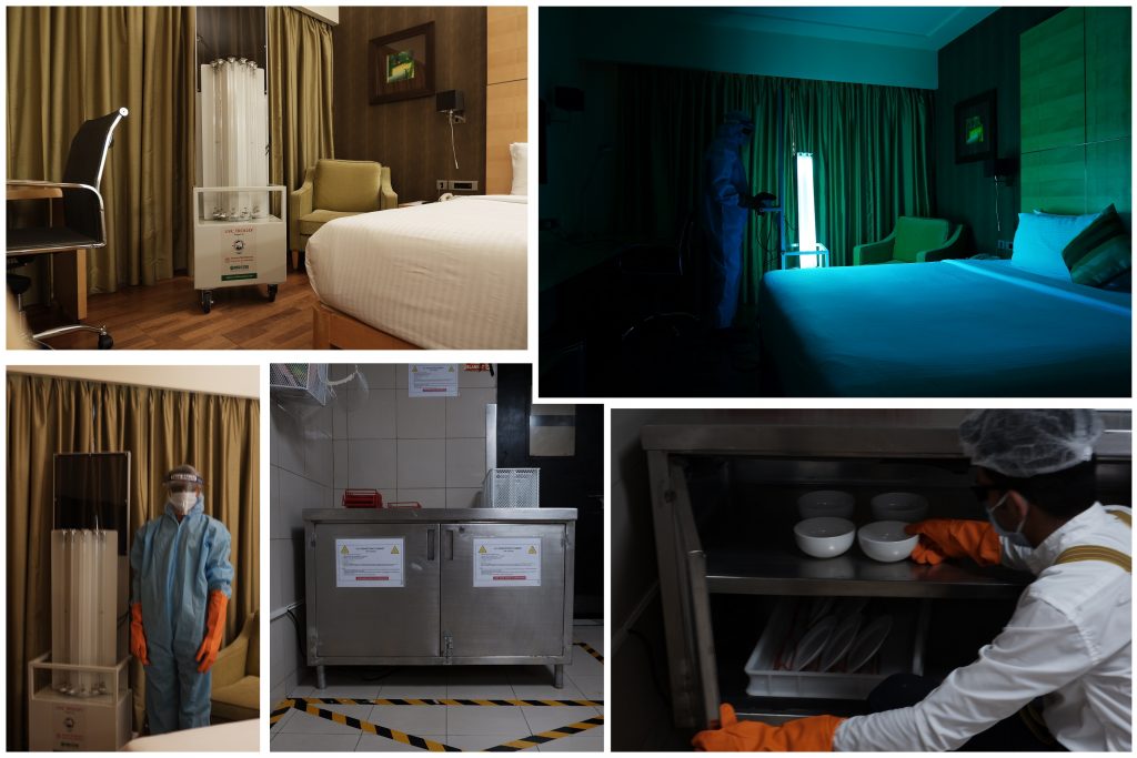 After a guest vacates his/her room and checks-out, rigorous cleaning procedure is carried out, as defined under the Accor safety standards ALLSAFE. After the rooms have been completely cleaned, a trained team member from the housekeeping team disinfects the room using this UV machine. This sterilisation process ensures elimination of any nano germ particle present in the room thus providing an additional layer of safety. Post this procedure, the room is sealed with a one-time tamper proof sticker on the door and no staff is allowed to enter the room. This provides an assurance to our guests that the room is safe in all aspects for the guest to check-in.
