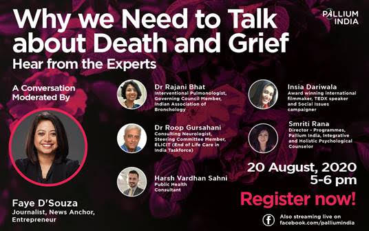 Thursday, August 20 (5 to 6 pm IST) – A conversation with an eclectic panel of experts from healthcare, civil society and public health to shine a light on how individuals may reshape their thoughts, fears and concern about death, equip them to have difficult conversations within their families and with healthcare providers and make decisions that are most appropriate for a meaningful life of quality. It is also a conversation about celebrating what it means to die with dignity when the time comes. The panel discussion will be held over a Zoom platform.
