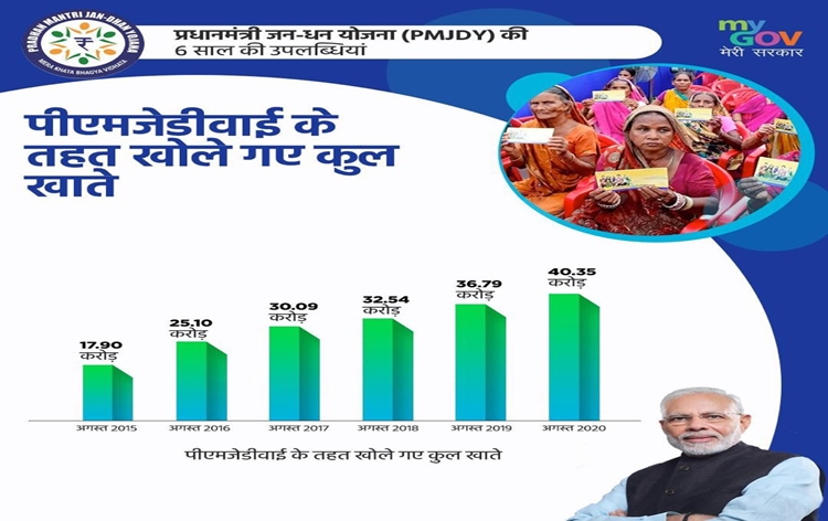 New Delhi: Modi government’s flagship financial inclusion programme Pradhan Mantri Jan Dhan Yojana (PMJDY) has completed six years today. The scheme was launched on 28th of August in 2014 with an aim to provide universal access to banking facilities to the people in the country. While launching the programme, Prime Minister Narendra Modi had described the occasion as a festival to celebrate the liberation of the poor from a vicious cycle. Over 40 crore 35 lakh bank accounts have been opened under the scheme since its inception and One lakh 31 thousand crore rupees have been deposited in these accounts. About eight crore PMJDY account holders are receiving Direct Benefit Transfer from the Government under various schemes.
