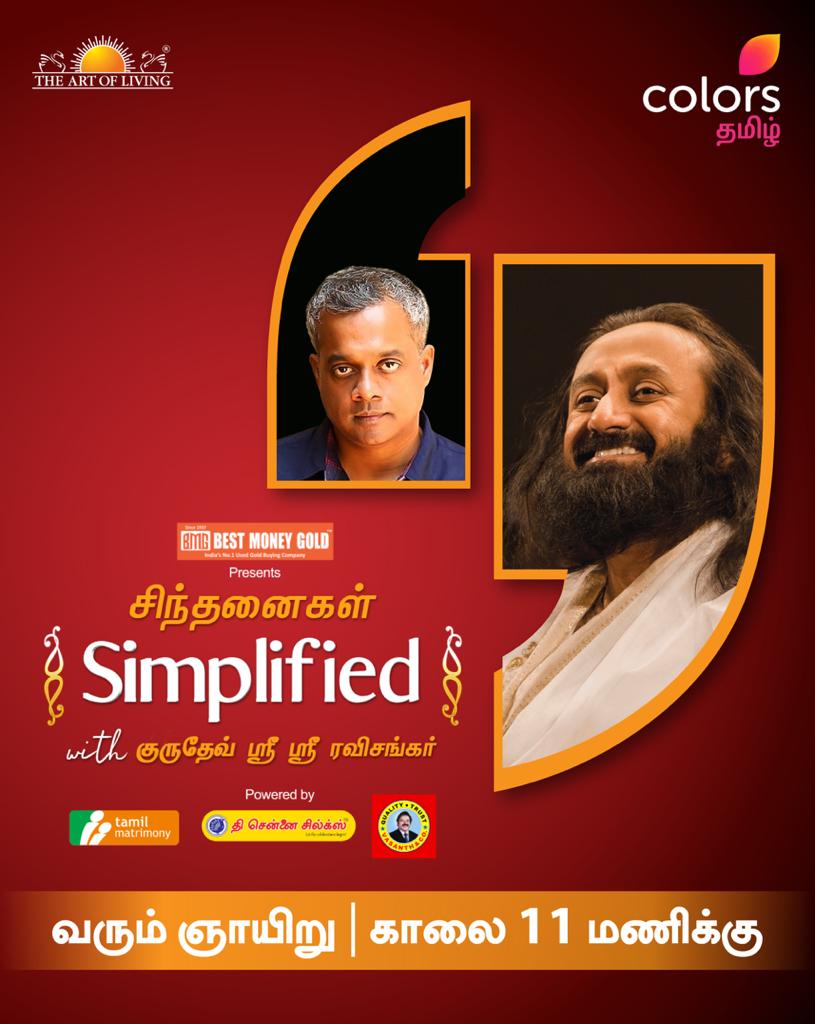 Chennai: Get ready to get a lot of your questions answered. as COLORS Tamil brings yet another intriguing episode of Sinthanaigal Simplified with Gurudev. Presenting its version of Manjal Veyil Malai, COLORS Tamil is all set to bring together the charismatic Director Gautam Vasudev Menon (GVM) in a heartfeld conversation with Shri Shri Ravishankar where they question and mull over finding happiness in chaos. Tune to the latest episode this Sunday, 13th September 2020 at 11:00 AM, to watch GVM picking Gurudev’s brain on balancing a myriad of emotions during the pandemic and a lot more. While you get ready to unwind and catch the show, we present you a quick round-up of what’s in store: