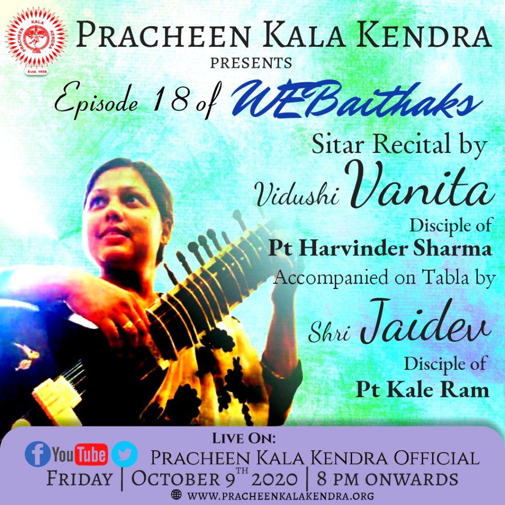 Pracheen Kala Kendra’s 18th Episode of WEB Baithaks by Pracheen Kala Kendra will feature Sitar Recital by Vidushi Vanita ,a senior disciple of Pt Harvinder Sharma who will be accompanied by her younger brother and amazing Tabla exponent Shri Jaidev Jai, son and disciple of Tabla Maestro Pt Kale Ram
