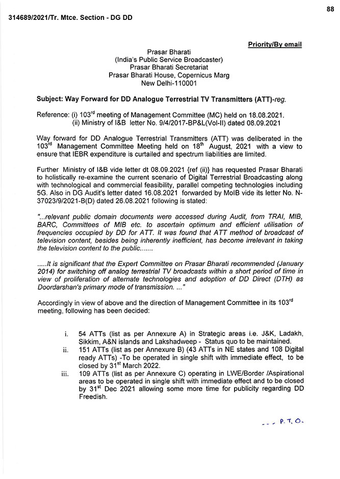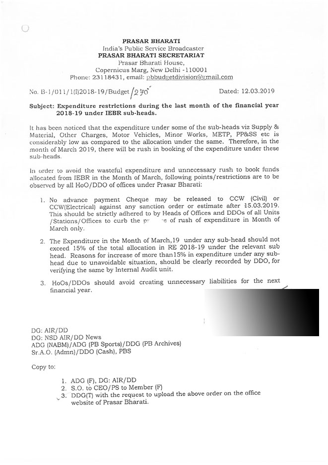 The below posted documents will elaborate more on Prasar Bharati’ “initiatives” to amplify the performance of the public broadcaster and most importantly curtail expenditure, make utmost  utilisation of human resource, save public money adhering the thoughts of Prime Minister Narendra Modi.