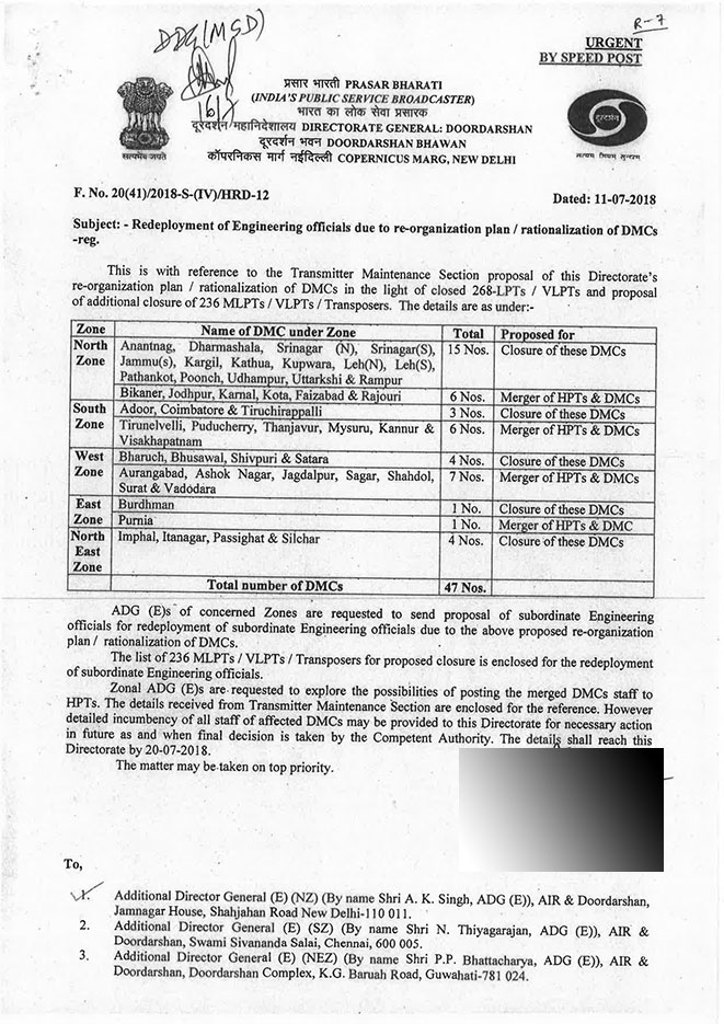 Informed sources from within said, the Prasar Bharati is under huge financial stress due to the existing surplus engineering staff. However “the authorities are continuing with recruitment extravaganza. Over 700 personals were recently inducted as Engineering Assistants and Transmission Executives without any assessment of manpower requirement. These appointments were happening while Prasar Bharati  has been closing down its  filed units and transmitters across the country and also maintaining surplus engineering staff at the cost of public money.”